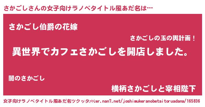 さかごしさんの女子向けラノベタイトル風あだ名は… 『異世界でカフェさかごしを開店しました。』『さかごし伯爵の花嫁』『横柄さかごしと宰相陛下』 ツクッター #女子向けラノベタイトル風あだ名ツクッター http://tkutter.nan7.net/joshimukeranobetaitoruadana/165836/