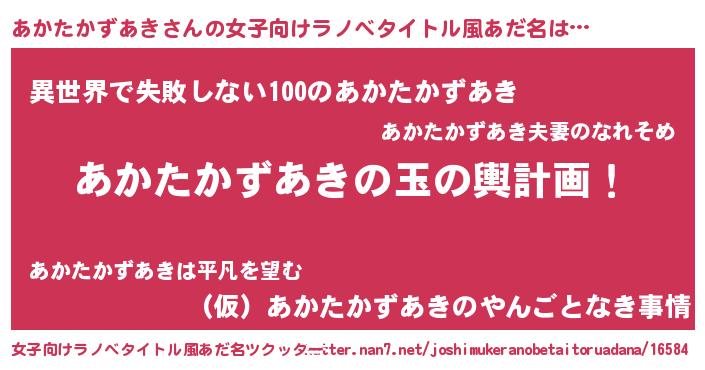 | 男性向けラノベタイトル風あだ名 | 『あかたかずあき~年齢イコール彼女いない歴の魔法使い~』 |