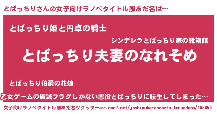 | 男性向けラノベタイトル風あだ名 | 『おまえをオタクにしてやるから、俺をとばっちりにしてくれ! 』 |