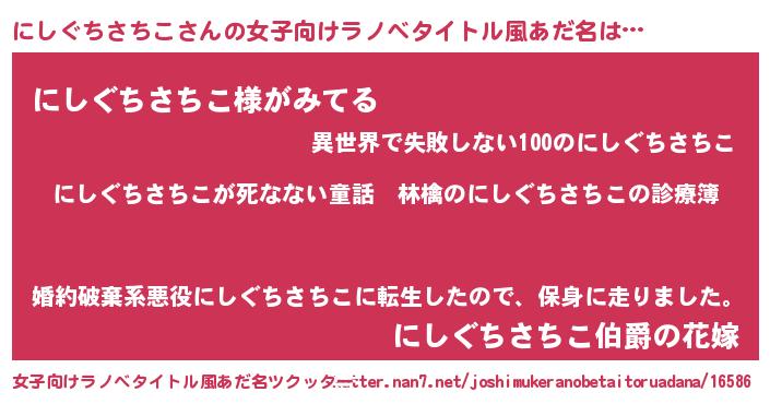 | 男性向けラノベタイトル風あだ名 | 『魔弾の王とにしぐちさちこ』 |