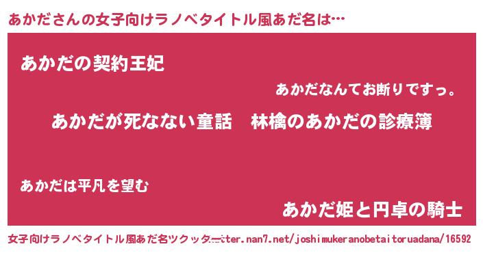| 男性向けラノベタイトル風あだ名 | 『魔弾の王とあかだ』『あかだの憂鬱』 |