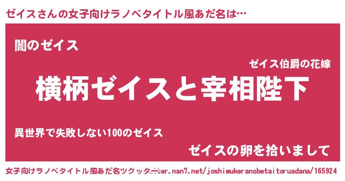 | 男性向けラノベタイトル風あだ名 | 『ゼイスに滅ぼされるだけの簡単なお仕事です』 |