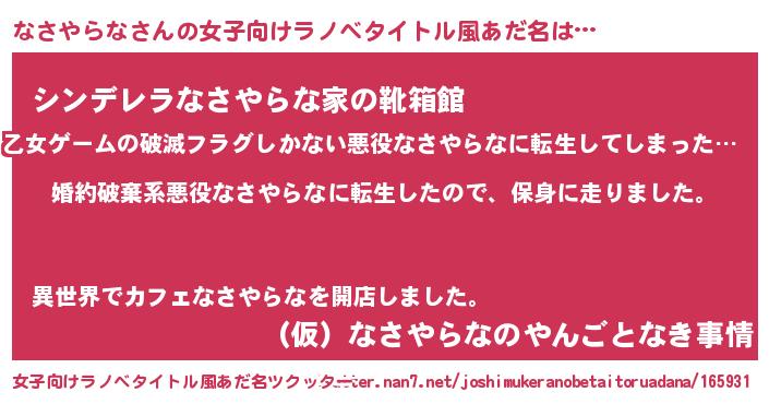 | 男性向けラノベタイトル風あだ名 | 『ナサヤラナスレイヤー』 |
