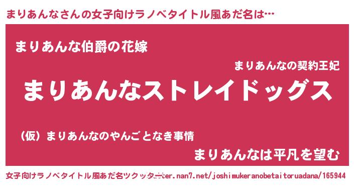 | 男性向けラノベタイトル風あだ名 | 『Re:まりあんなから始める異世界生活』 |
