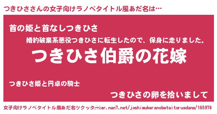 | 男性向けラノベタイトル風あだ名 | 『やはりつきひさの青春ラブコメはまちがっている 』 |