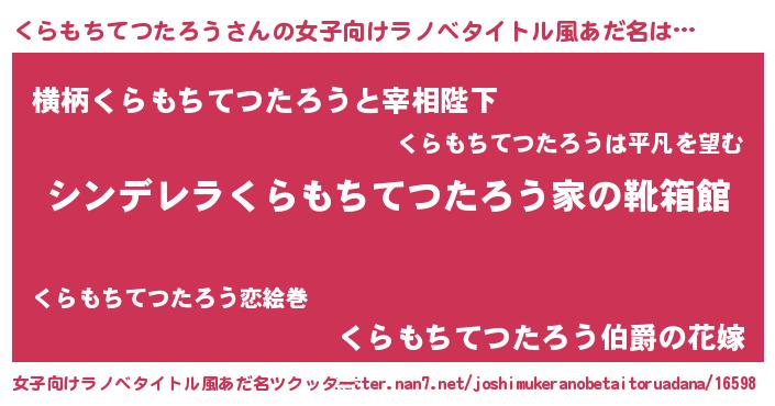 | 男性向けラノベタイトル風あだ名 | 『冴えないくらもちてつたろうの育てかた』 |