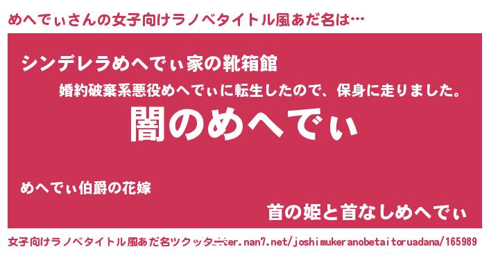 | 男性向けラノベタイトル風あだ名 | 『Re:めへでぃから始める異世界生活』 |