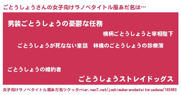 | 男性向けラノベタイトル風あだ名 | 『魔弾の王とごとうしょう』 |