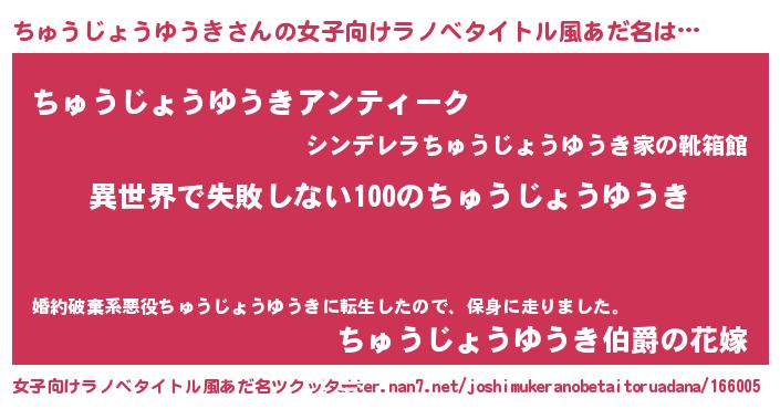 | 男性向けラノベタイトル風あだ名 | 『ちゅうじょうゆうきという概念が存在しない退屈な世界 』 |