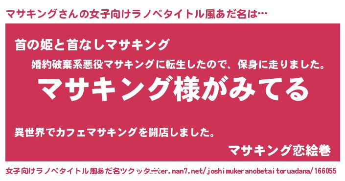 | 男性向けラノベタイトル風あだ名 | 『マサキングの嫁は女の子じゃないと思った?』 |