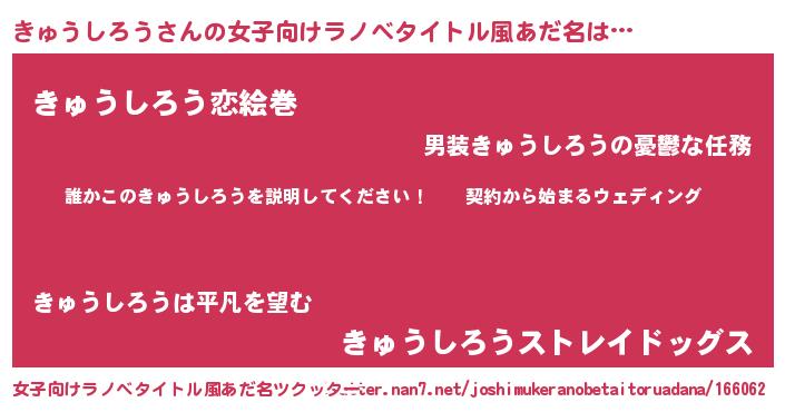 | 男性向けラノベタイトル風あだ名 | 『キュウシロウアートオンライン』 |