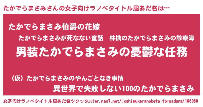 | 男性向けラノベタイトル風あだ名 | 『うちのたかでらまさみが世界を掌握している!』 |