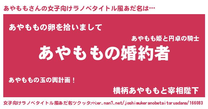 あやももさんの女子向けラノベタイトル風あだ名は… 『あやももの婚約者』『あやももの卵を拾いまして』『横柄あやももと宰相陛下』 ツクッター #女子向けラノベタイトル風あだ名ツクッター http://tkutter.nan7.net/joshimukeranobetaitoruadana/166083/
