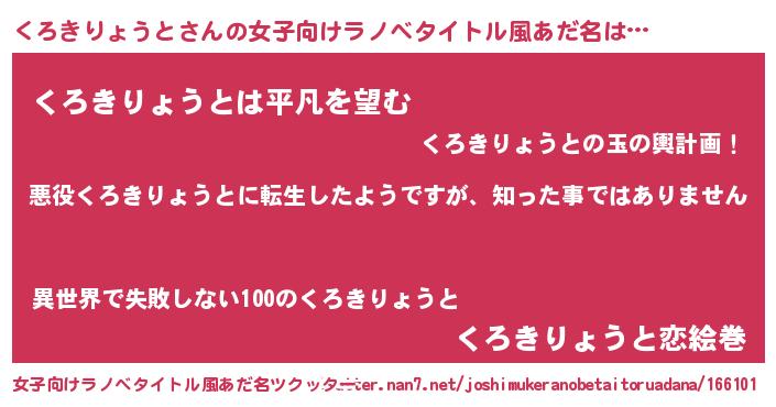 | 男性向けラノベタイトル風あだ名 | 『この素晴らしい世界にくろきりょうとを!』 |