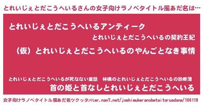 | 男性向けラノベタイトル風あだ名 | 『とれいじぇとだこうへいるの憂鬱』 |