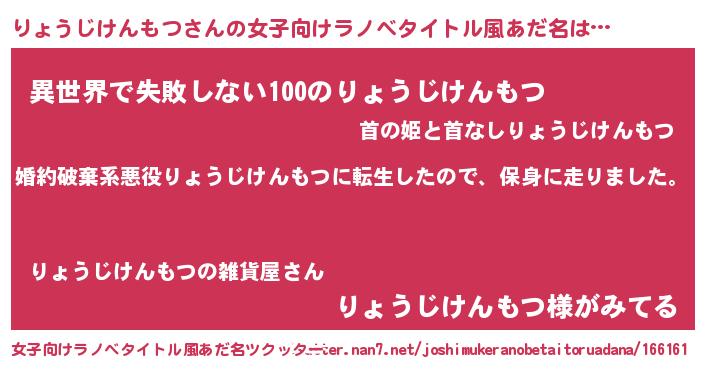 | 胡散臭い通販商品みたいなあだ名 | 『絶対に幸福をもたらす招き猫…その名も「りょうじけんもつ」』 |