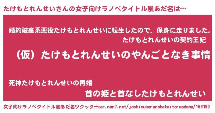 | 男性向けラノベタイトル風あだ名 | 『たけもとれんせいの憂鬱』 |