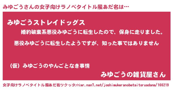 | 男性向けラノベタイトル風あだ名 | 『この素晴らしい世界にみゆごうを!』 |