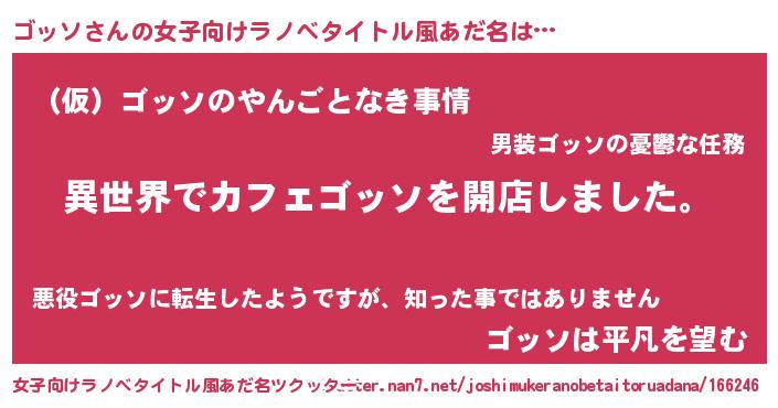| 男性向けラノベタイトル風あだ名 | 『誰もが恐れるあのゴッソが、ぼくの専属メイドになるようです。』 |