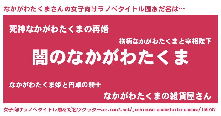| 男性向けラノベタイトル風あだ名 | 『Re:なかがわたくまから始める異世界生活』 |