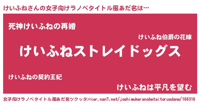 | 男性向けラノベタイトル風あだ名 | 『Re:けいふねから始める異世界生活』 |