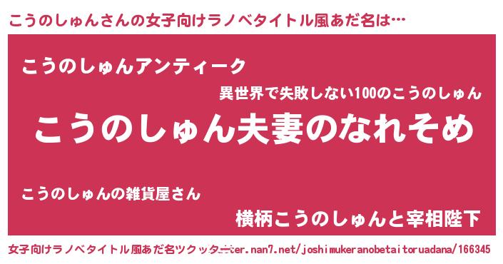| 男性向けラノベタイトル風あだ名 | 『おまえをオタクにしてやるから、俺をこうのしゅんにしてくれ! 』 |