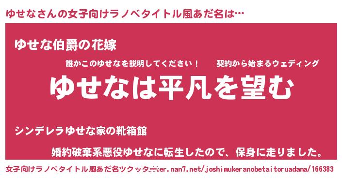 | 男性向けラノベタイトル風あだ名 | 『ダンジョンにゆせなを求めるのは間違っているだろうか』 |
