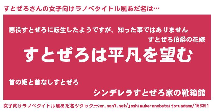 | 胡散臭い通販商品みたいなあだ名 | 『信頼と実績のサプリメント…その名も「すとぜろ」』 |