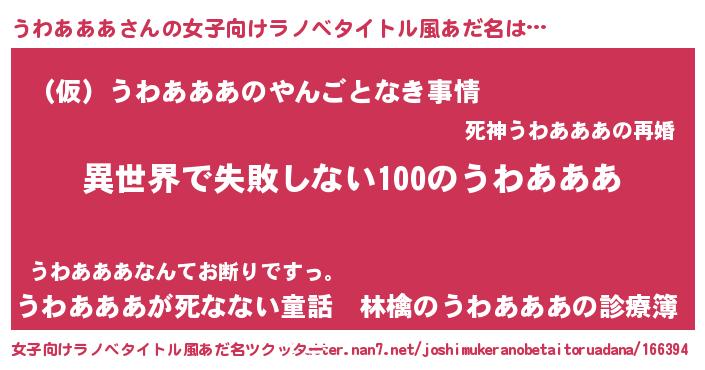 | 意味不明あだ名 | 『永久保存うわあああ』『自称うわあああ』 |