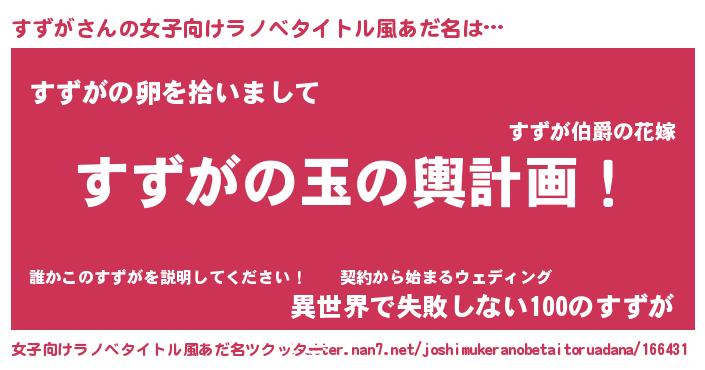 | 男性向けラノベタイトル風あだ名 | 『すずが~年齢イコール彼女いない歴の魔法使い~』 |
