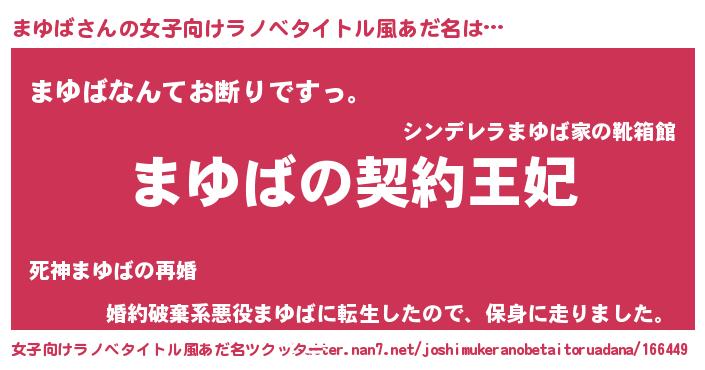 まゆばさんの女子向けラノベタイトル風あだ名は… 『まゆばの契約王妃』『まゆばなんてお断りですっ。』『婚約破棄系悪役まゆばに転生したので、保身に走りました。』 ツクッター #女子向けラノベタイトル風あだ名ツクッター http://tkutter.nan7.net/joshimukeranobetaitoruadana/166449/