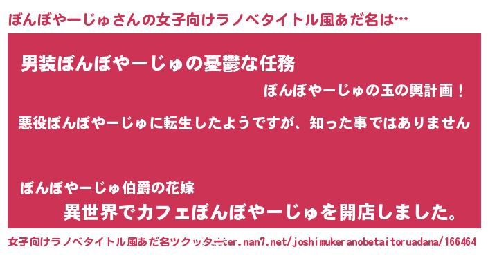 | 胡散臭い通販商品みたいなあだ名 | 『あなたにだけ特別に提供する100年もののヴィンテージワイン…その名も「ぼんぼやーじゅ」』 |