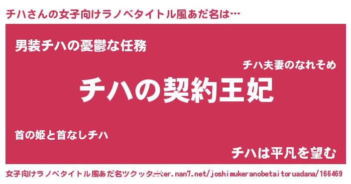 チハさんの女子向けラノベタイトル風あだ名は… 『チハの契約王妃』『男装チハの憂鬱な任務』『チハは平凡を望む』 ツクッター #女子向けラノベタイトル風あだ名ツクッター http://tkutter.nan7.net/joshimukeranobetaitoruadana/166469/