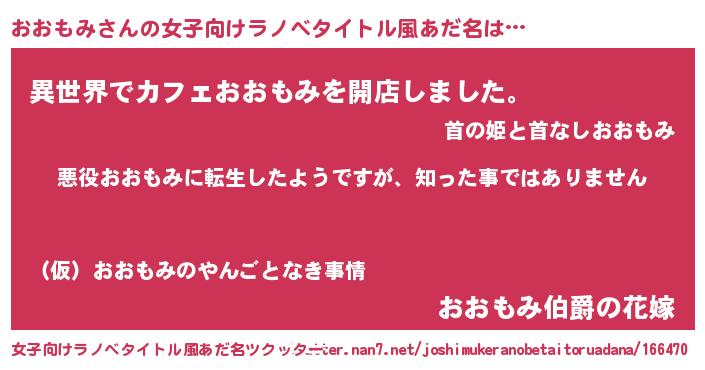 | 男性向けラノベタイトル風あだ名 | 『この素晴らしい世界におおもみを!』 |
