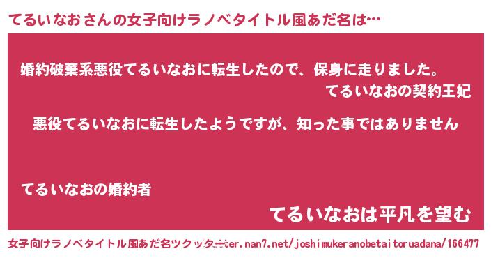 | 男性向けラノベタイトル風あだ名 | 『この素晴らしい世界にてるいなおを!』 |