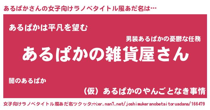 | 男性向けラノベタイトル風あだ名 | 『やはりあるぱかの青春ラブコメはまちがっている 』 |