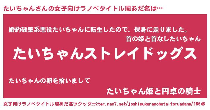 | 男性向けラノベタイトル風あだ名 | 『Re:たいちゃんから始める異世界生活』 |