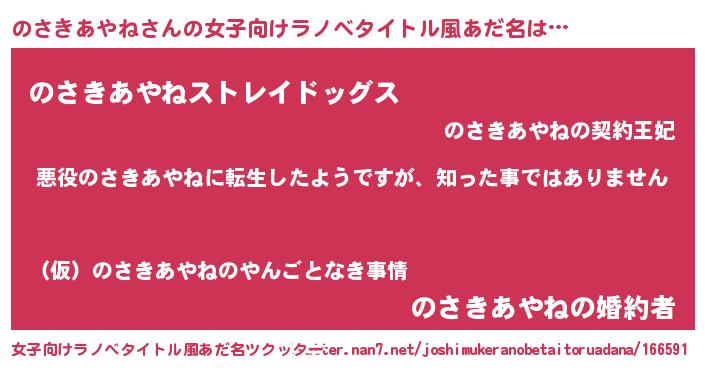 | 男性向けラノベタイトル風あだ名 | 『この素晴らしい世界にのさきあやねを!』 |