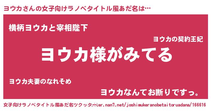 | 男性向けラノベタイトル風あだ名 | 『ヨウカの嫁は女の子じゃないと思った?』 |