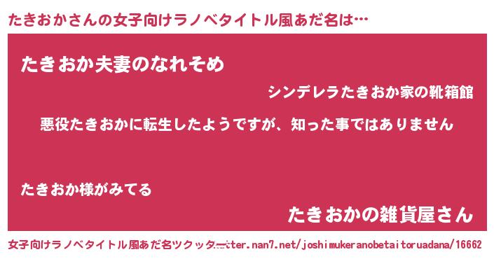 | 男性向けラノベタイトル風あだ名 | 『この素晴らしい世界にたきおかを!』 |