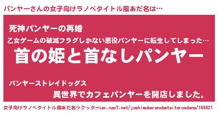 パンヤーさんの女子向けラノベタイトル風あだ名は… 『首の姫と首なしパンヤー』『死神パンヤーの再婚』『異世界でカフェパンヤーを開店しました。』 ツクッター #女子向けラノベタイトル風あだ名ツクッター http://tkutter.nan7.net/joshimukeranobetaitoruadana/166621/