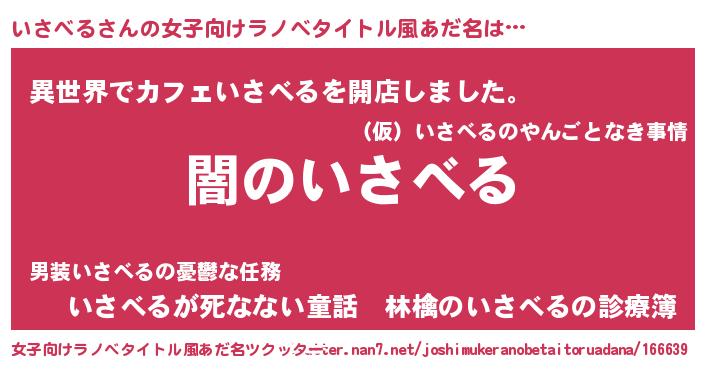 | 男性向けラノベタイトル風あだ名 | 『Re:いさべるから始める異世界生活』 |