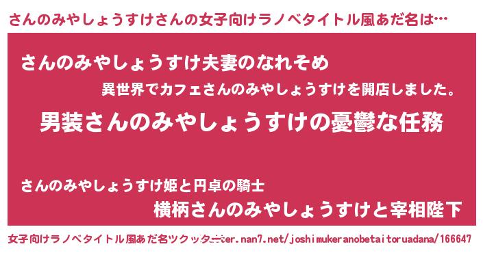 | 男性向けラノベタイトル風あだ名 | 『うちのさんのみやしょうすけが世界を掌握している!』 |