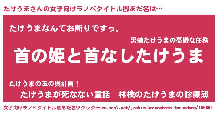 | ヒーロー風カッコイイあだ名 | 『ウルトラ戦士タケウマ』『仮面タケダー』 |