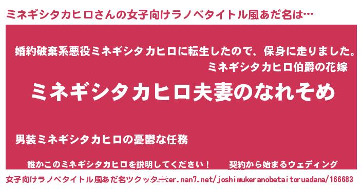 | 男性向けラノベタイトル風あだ名 | 『おまえをオタクにしてやるから、俺をミネギシタカヒロにしてくれ! 』 |