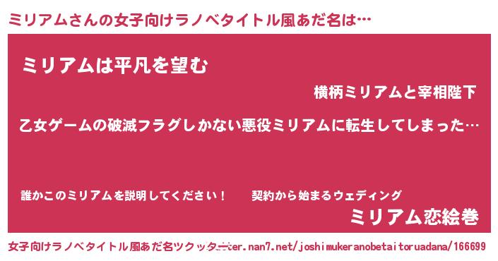 | 男性向けラノベタイトル風あだ名 | 『この素晴らしい世界にミリアムを!』 |