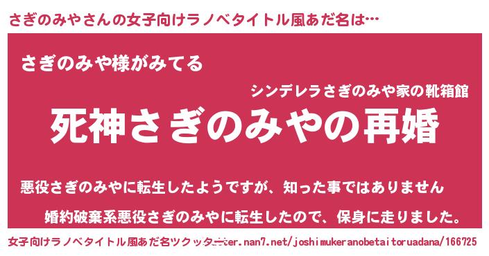 | 男性向けラノベタイトル風あだ名 | 『ノーゲーム・ノーサギノミヤ』 |