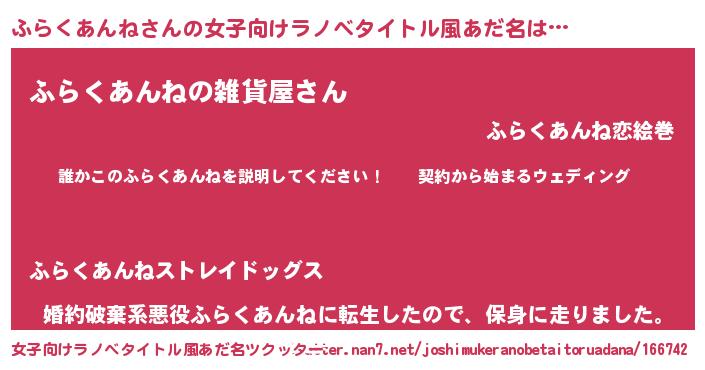 | 胡散臭い通販商品みたいなあだ名 | 『億万長者になれるブレスレット…その名も「ふらくあんね」』 |