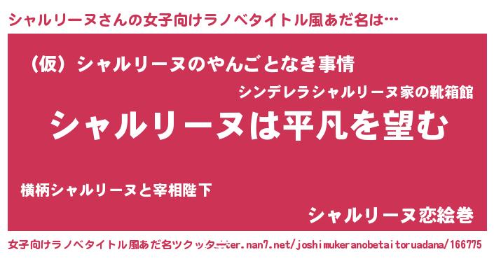 シャルリーヌさんの女子向けラノベタイトル風あだ名は… 『シャルリーヌは平凡を望む』『(仮)シャルリーヌのやんごとなき事情』『シャルリーヌ恋絵巻』 ツクッター #女子向けラノベタイトル風あだ名ツクッター http://tkutter.nan7.net/joshimukeranobetaitoruadana/166775/
