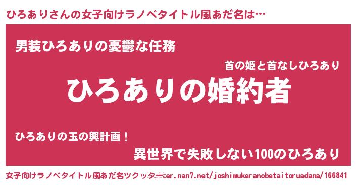 | 男性向けラノベタイトル風あだ名 | 『うちの娘の為ならば、俺はもしかしたらひろありも倒せるかもしれない。』 |